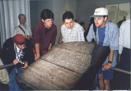 | There were also sandals that were 2000 years old that looked a lot like today’s sandals. The most impressive piece of all was the rosetta stone. The historical significance of that one find is spectacular. We then ate at a restaurant where afterwards Arnie had a gigantic banana split. We then went back to the rooms and said goodbye to Cate. |