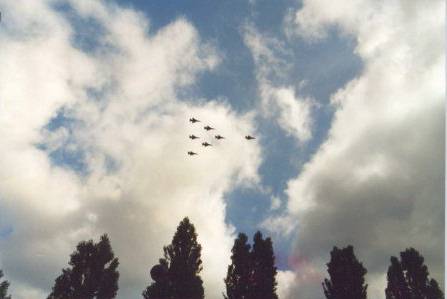 | We met the Ytreeides for breakfast at around 9:45AM. We ate at the hotel's café. Today is Bastille Day in France. There will be much celebration again. While we ate breakfast, fighter jets flew over our area. It was fun because we were watching TV and we would see the jets there and then shortly thereafter we would see them live. The first jets had red, white, and blue smoke trailing them. |